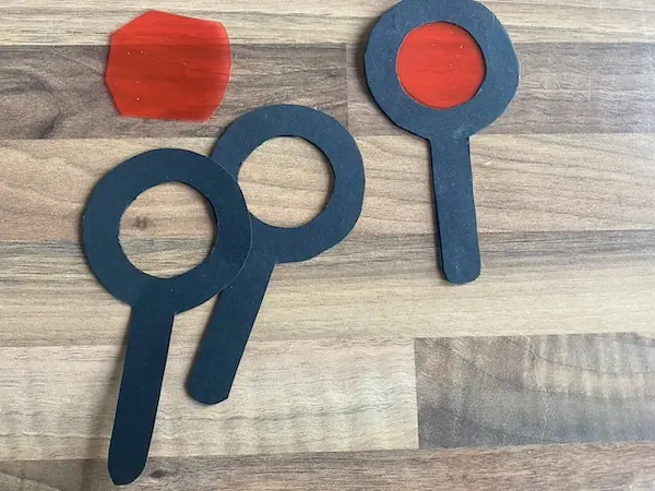 Du brauchst pro Einladung zwei davon. - Schneide die rote Folie, etwas kleiner als das Loch in der Lupe, aus.