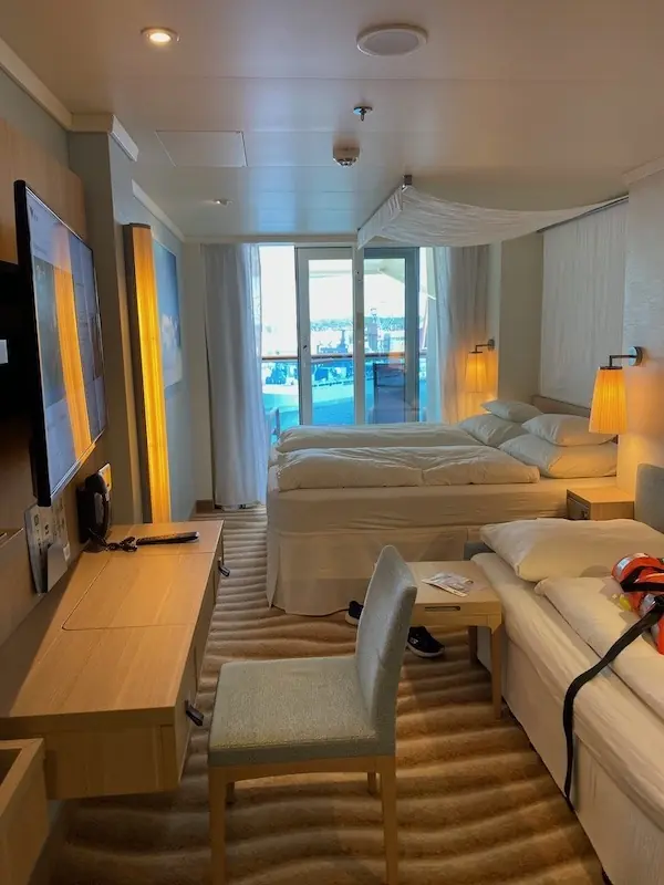 Unsere Kabine lag auf Deck 15 und bot ausreichend Platz für uns drei. Es waren ein paar m2 mehr als in der Balkonkabine. Für eine Familie mit 2 Kindern fände ich sie allerdings zu eng.