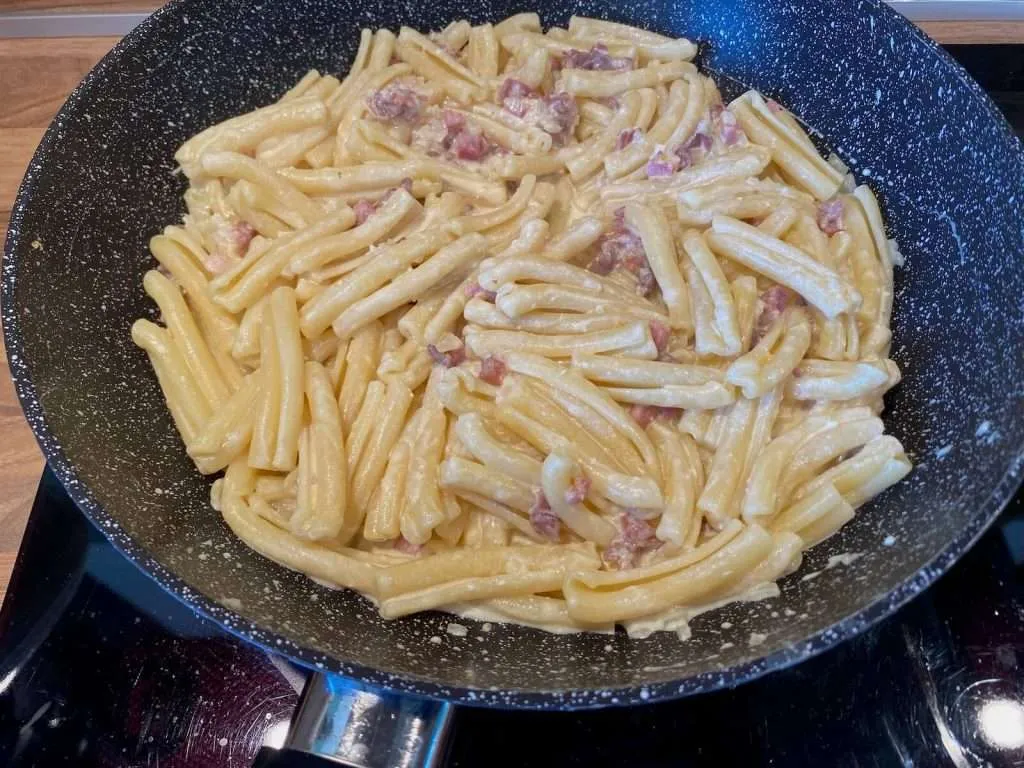 - Nudeln unter die Soße mischen und kurz warm werden lassen.