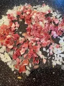 - Rohen Schinken ebenfalls in kleine Würfel/Quadrate schneiden und zu den Zwiebeln geben.