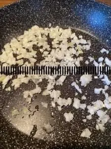 - Zwiebel klein würfelig schneiden und in der Pfanne mit etwas Öl glasig anbraten.