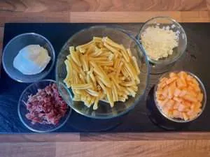 Welche Nudeln du nimmst, bleibt ganz dir überlassen. Wir mögen sie gerne mit Penne oder Muschelnudeln oder Makkaroni.