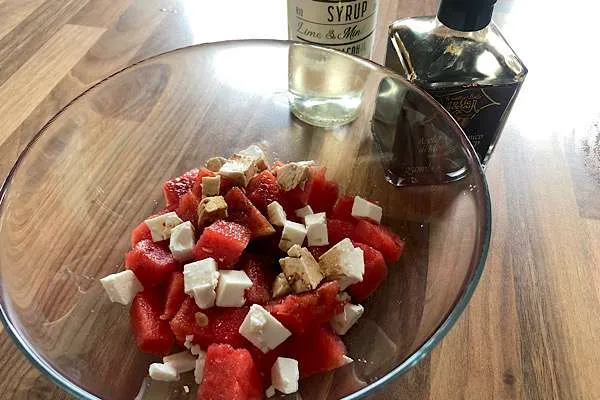 Es ist eine köstliche Kombination aus saftiger Wassermelone, Minze und cremigem Feta-Käse, die zusammen mit Balsamico-Essig und Minzsirup mariniert werden. Es gibt davon unzählige Varianten – mit Zwiebel, Lauch, Gurke, Oliven, Ruccola und vieles mehr.