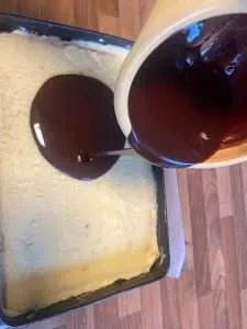 Jetzt nur noch die flüssige Schokomasse über den Kuchen gießen, verteilen und glatt streichen.