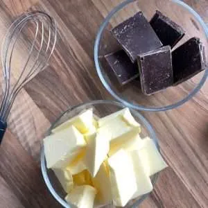 Dafür einfach die Kochschokolade in kleine Stücke schneiden und mit der Butter in eine Schüssel geben.