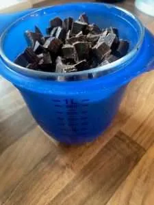Vielleicht kennst du aber noch andere Möglichkeiten, um Schokolade zu schmelzen? Mikrowelle? Kochtopf? Mach es einfach so, wie du es immer machst. Achte nur darauf, dass die Masse nicht zu heiß wird, sonst wird daraus ein „Klumpen“ und keine flüssige Masse.