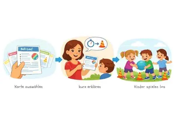Du greifst einfach in deinen Stapel Karten und weißt sofort: das hier ist ein Bewegungsspiel für 6 Kinder, das dauert 10 Minuten, dafür brauche ich nur einen Ball. Erklärst das Spiel in ein paar Sätzen und die Kinder legen direkt los.